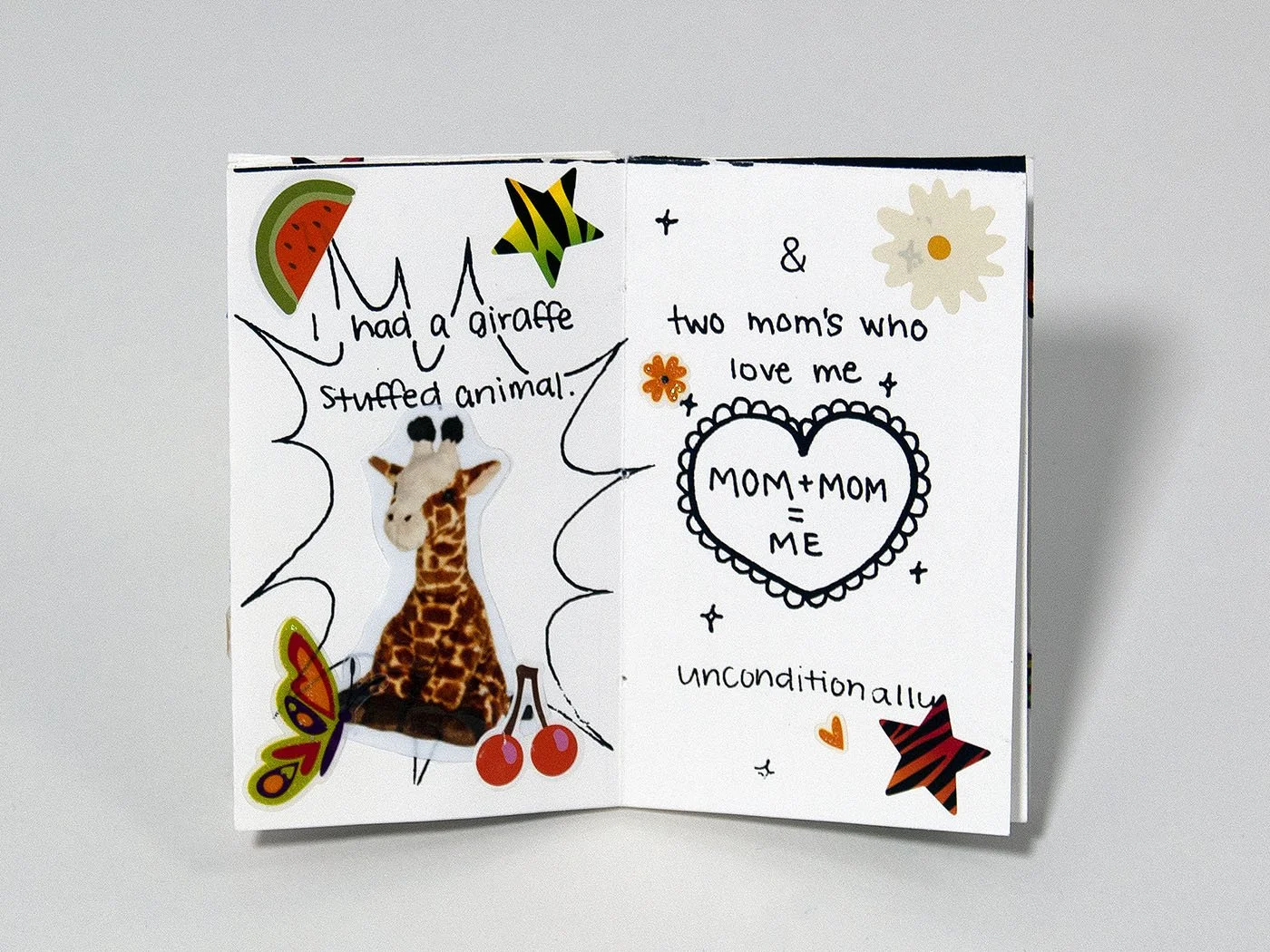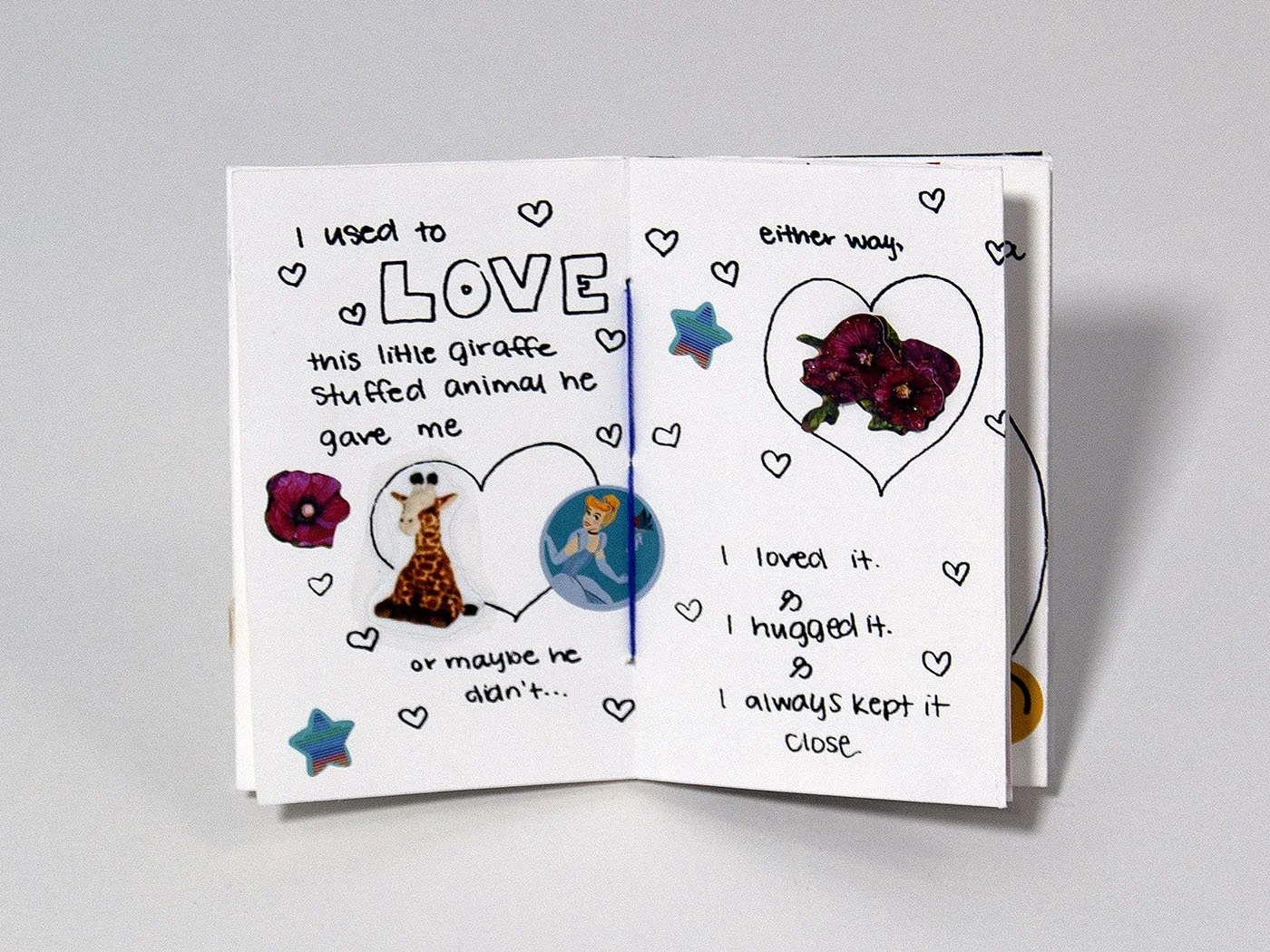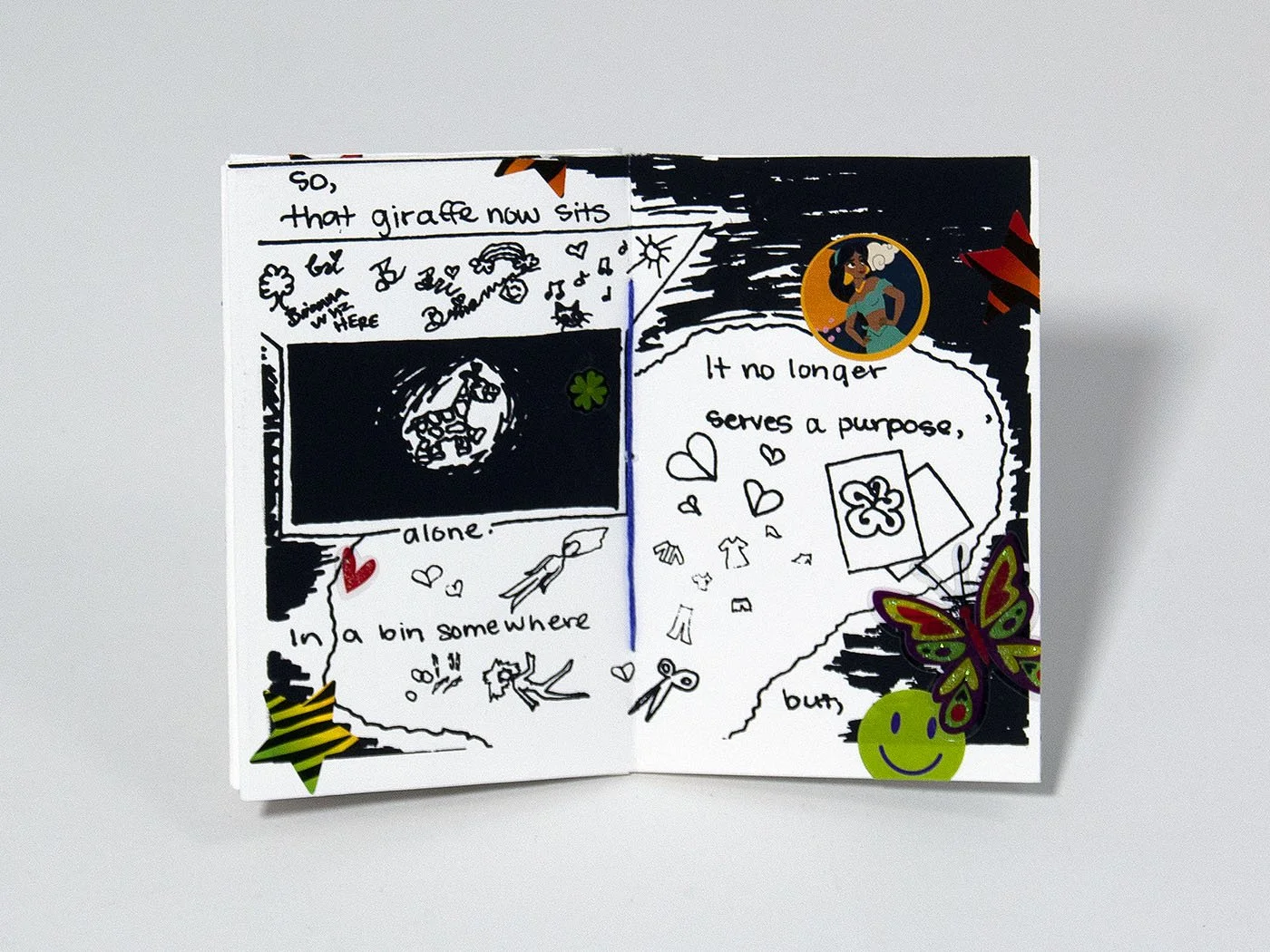 My Stuffed Giraffe, Screenprinted Zine with Stickers and Embroidery Floss, 8 1/2 x 11” 2023