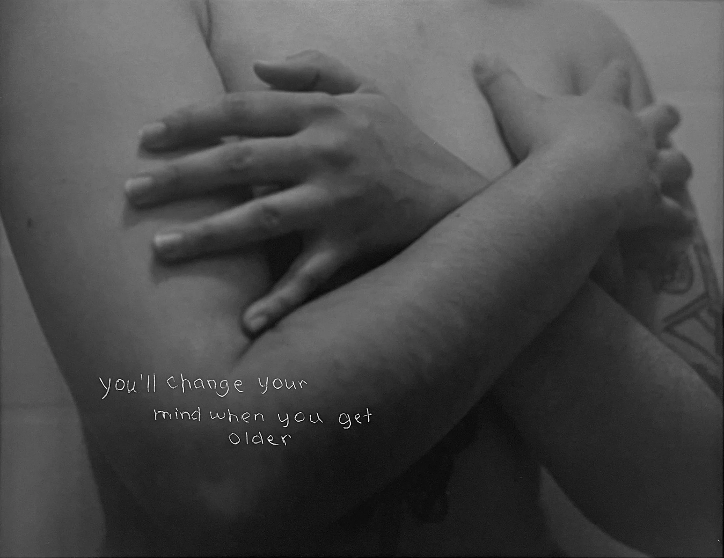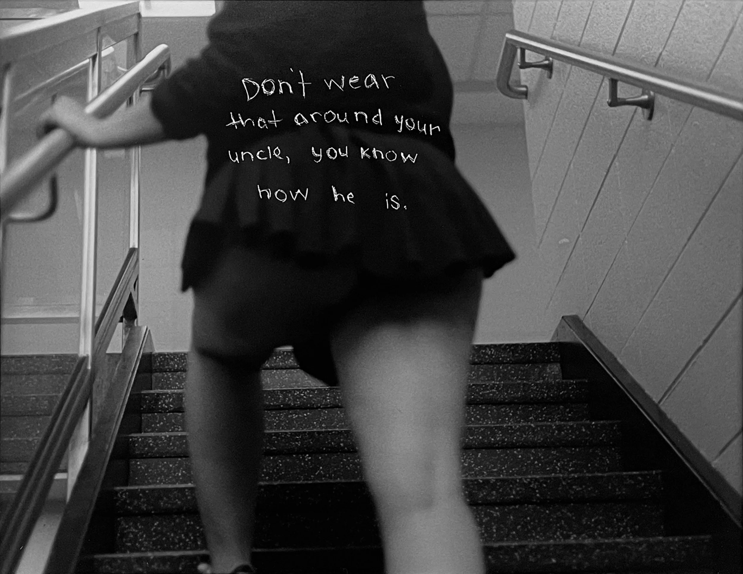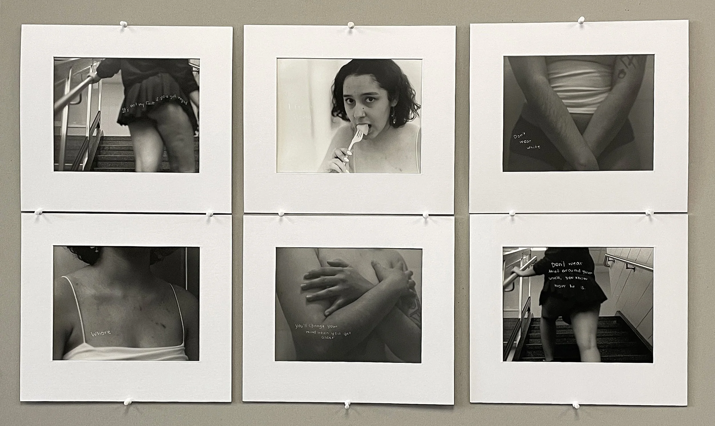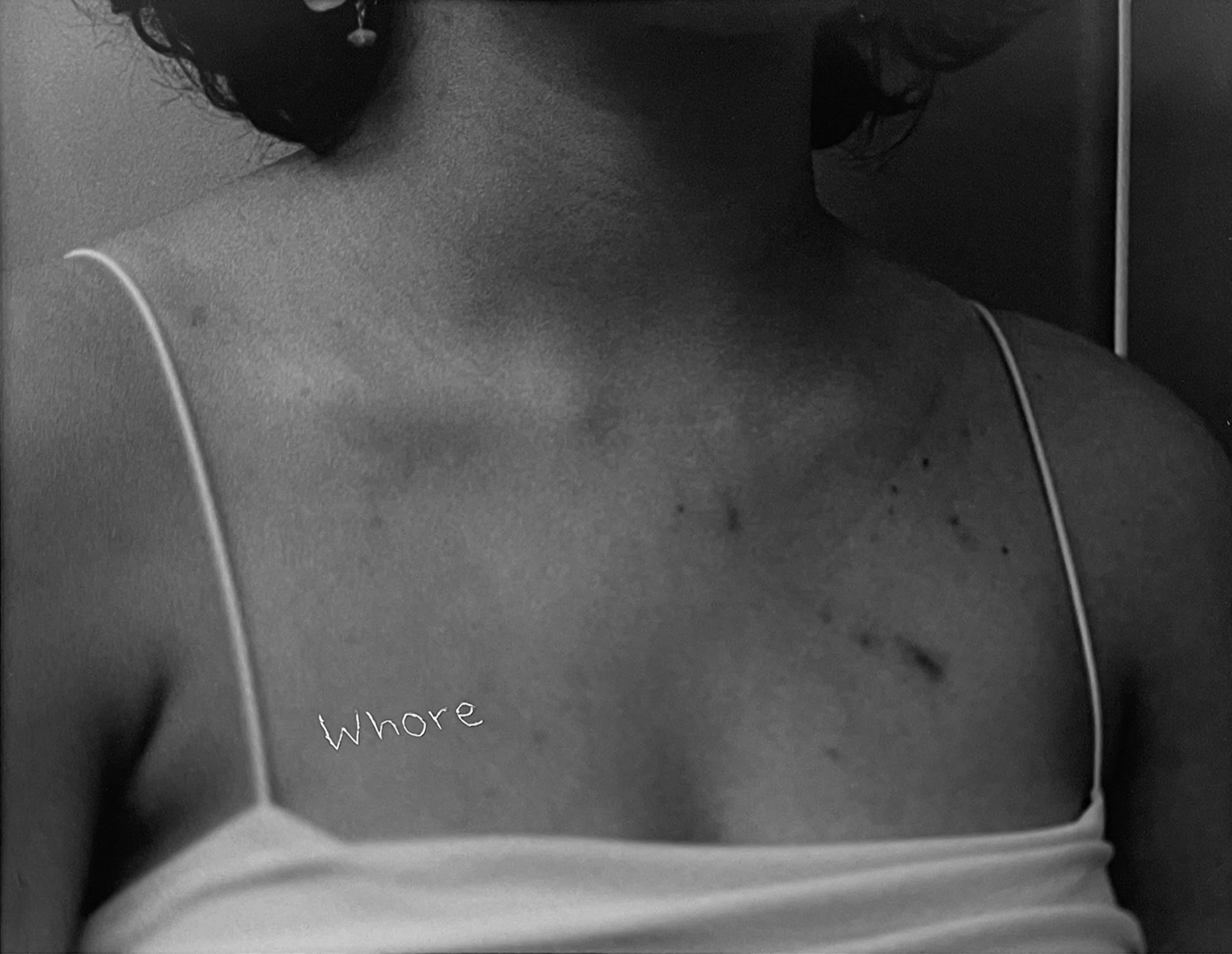 “Prey” explores a clash of perspectives: predatory stares, invasive glances, and catcalling, paired with the intimate moments of reflection on how those words have affected me. Through this photo series I examine the tension between vulnerability and survival as a woman. By carving the harmful words and phrases I grew up hearing all the time into each image, I am finally able to confront and purge them in a raw, unflinching way. Allowing the years of pain to be witnessed and heard by others and freeing myself from the cycle.